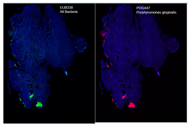 图1.根尖周病变样本微生物FISH检测(绿色: 全细菌探针;红色:牙龈卟啉单胞菌探针)